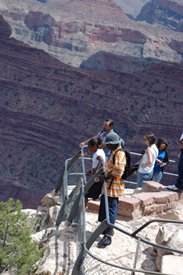 Three of Founders Academy students at a Grand Canyon overlook. Right to left, Matthew (stripped shirt), Adrianna (white shirt), Stephannie (blue shirt).