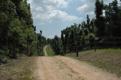 The gate and driveway off the gravel road leading to our secluded property. The farm sits along Crowley's Ridge, an unusual geological formation that rises above the alluvial plain of the Mississippi River embankment. The ridge runs along a 150-mile line from southeastern Missouri to the Mississippi River near Helena, Arkansas.